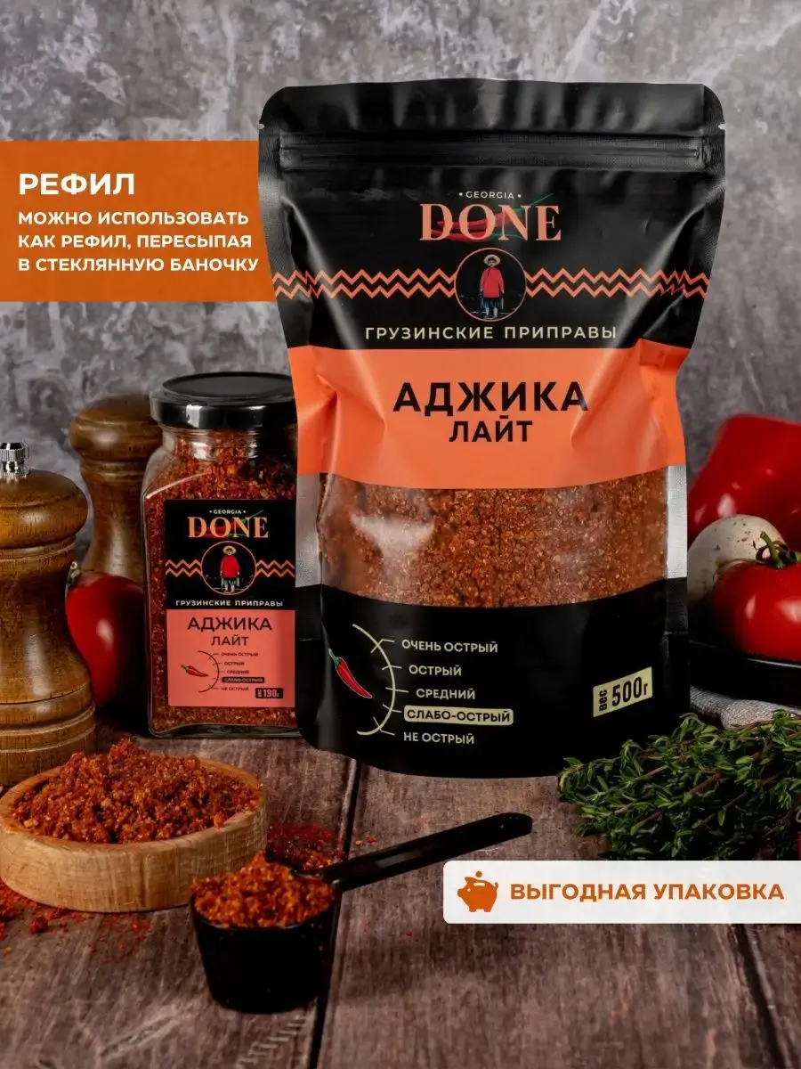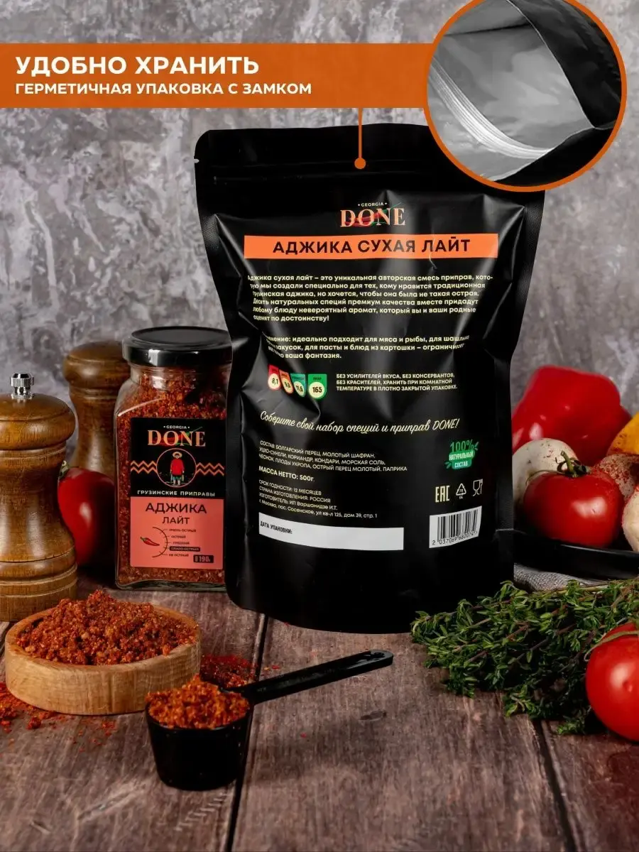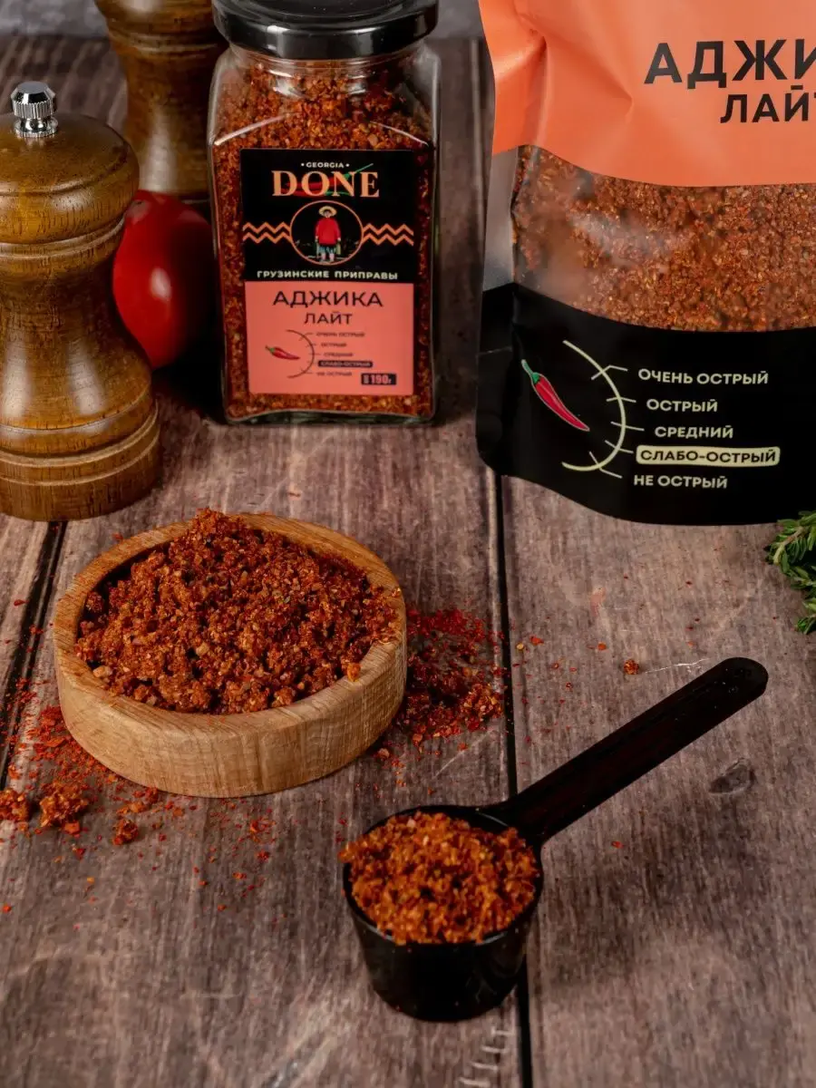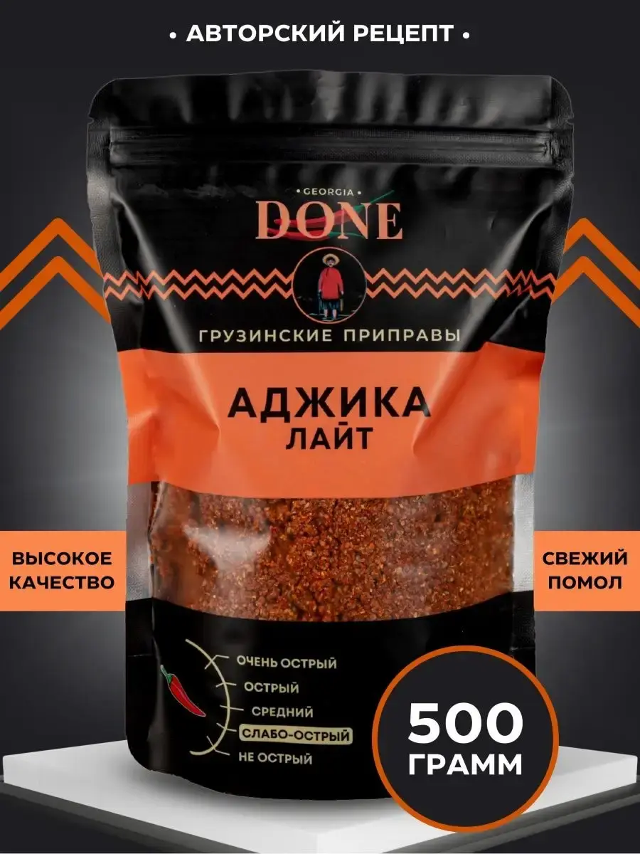 Аджика сухая ЛАЙТ - это уникальная авторская смесь приправ, которую мы создали специально для тех, кому нравится традиционная грузинская аджика, но хочется, чтобы она была не такая острая. Десять натуральных специй премиум качества вместе придадут любому блюду невероятный аромат, который вы и ваши родные оценят по достоинству! Универсальная приправа аджика домашняя Грузия идеально подходит для мяса и рыбы , для шашлыка , для супов и закусок, для пасты и блюд из картошки - ограничивает вас только ваша фантазия. Аджика кавказская классическая , как аджика абхазская зеленая амца натрули кубаночка адыгейская уляпская. Соберите свой набор специй с пряностями и приправами DONE , откройте для себя все вкусы мира . Приправы в банках незаменимые помощники хозяйки или хозяина на кухне, а качество и аромат свежесмолотых специй ДОНЕ по праву ценят шеф-повара лучших ресторанов Москвы. Баночки для специй - прекрасный повод порадовать близких, сделать подарок для подруги, для бабушки, для мамы или сестре. Скоро праздники и наши вкусные подарки станут отличным дополнением новогоднего стола, хороший подарок на новый год подруге, любимому человеку . Мы будем рады вашим отзывам, фотографиям блюд и будем особенно благодарны, если вы добавите наш бренд в избранное, потому что нам есть чем вас удивить! Выбирайте лучшие грузинские специи!