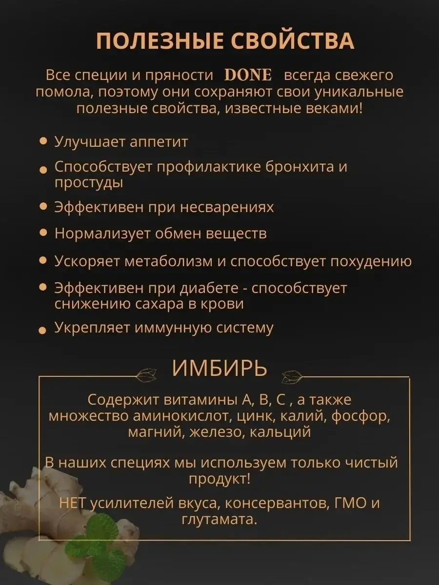 Имбирь молотый - перемолотый до состояния порошка корень имбиря. Терпкий аромат и жгучий вкус имбиря делает его подходящей приправой к мясным и рыбным блюдам бульонам салатам и соусам. Суперфуд имбирь можно добавлять в каши сыры блюда из бобовых культур овощные и грибные закуски. Имбирь можно добавлять и в напитки например компоты и кисели, а также имбирь широко применяется в выпечке ( имбирные пряники печенье ). Имбирь сушеный молотый является прекрасной специей для чая и кофе глинтвейна . Корень имбиря способствует похудению, улучшает аппетит, стимулирует образование желудочного сока, улучшает секрецию желудка, эффективен при несварениях, пища с добавлением имбиря становится более легкой и лучше усваивается. Соберите свой набор специй с пряностями и приправами DONE , откройте для себя все вкусы мира . Приправы в банках незаменимые помощники хозяйки или хозяина на кухне, а качество и аромат специй ДОНЕ по праву ценят шеф-повара лучших ресторанов Москвы. Мы будем рады вашим отзывам, фотографиям блюд и будем особенно благодарны, если вы добавите наш бренд в избранное, потому что нам есть чем вас удивить! Выбирайте лучшие грузинские специи!