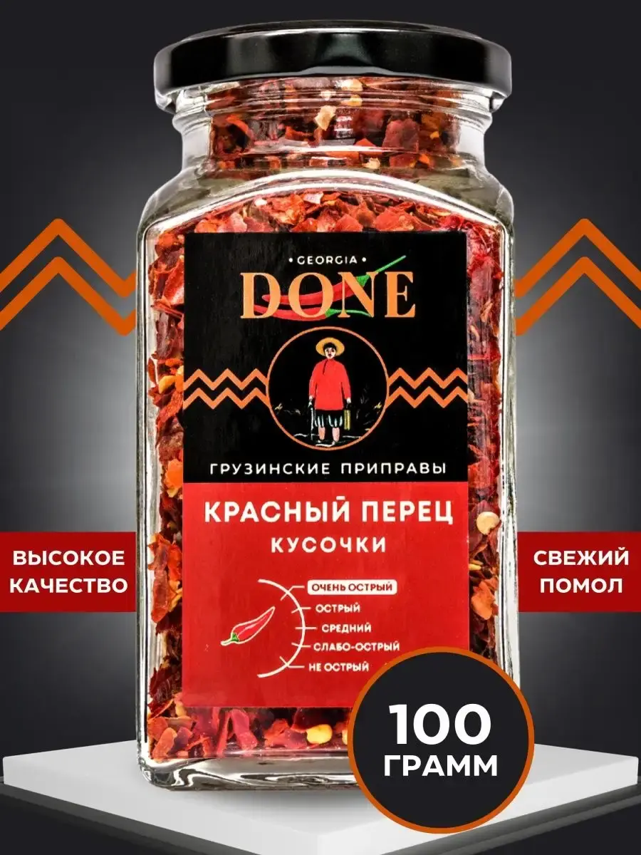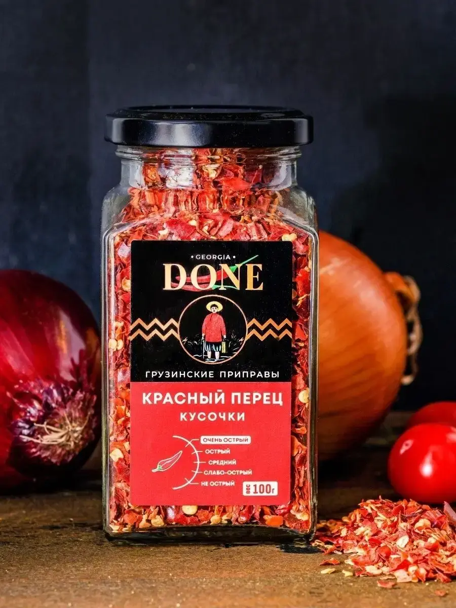 Острый красный перец хлопьями - это кусочки из высушенных плодов лучших сортов стручкового жгучего красного перца. Острота и аромат сушеного перца сделали его одной из самых популярных специй в Индии. Жгучий острый красный перец кусочками популярен также в азиатской, испанской, мексиканской кухне. Острый красный перец хлопьями идеально подходит для рыбы , мяса и овощей, блюд, а также его используют при приготовлении острых соусов, кетчупов, колбасы , для плова, горячих блюд и шашлыка . Перец красный чили кусочками придает пикантный вкус и яркий цвет супам, рагу, гуляшу. Паприка красная острая стимулирует работу ЖКТ, положительно влияет на зрение, обладает антибактериальными свойствами и считается незаменимым помощником во время эпидемий ОРВИ. Красный перец – универсальная приправа входит в состав многих смесей специй и приправ , например, в аджику. Соберите свою коллекцию вкусов со всего мира вместе с DONE. Баночки для специй - прекрасный повод порадовать близких, сделать подарок для подруги, для бабушки, для мамы или сестре. Скоро праздники и наши вкусные подарки станут отличным дополнением новогоднего стола, хороший подарок на новый год подруге, любимому человеку. Мы будем рады вашим отзывам, фотографиям блюд и будем особенно благодарны, если вы добавите наш бренд в избранное, потому что нам есть чем вас удивить! Выбирайте лучшие грузинские специи!