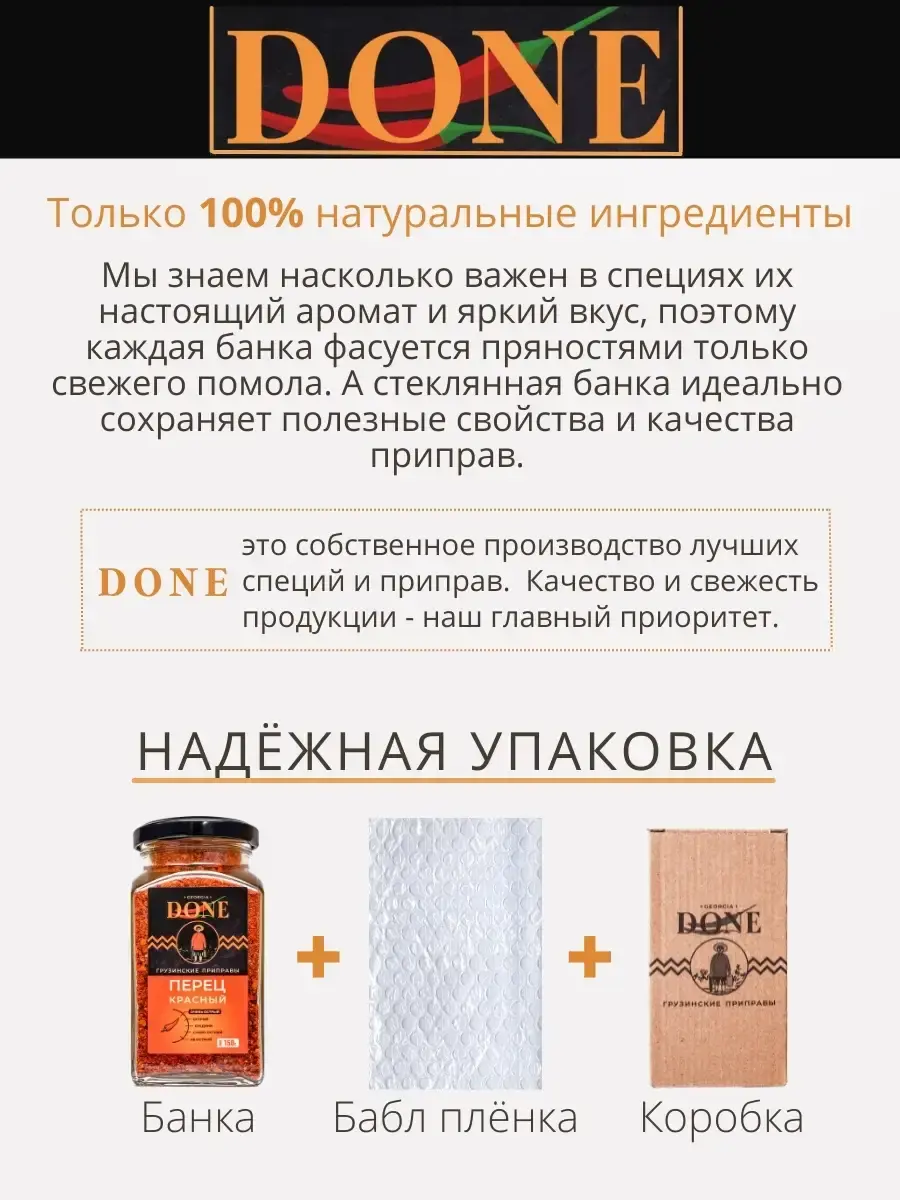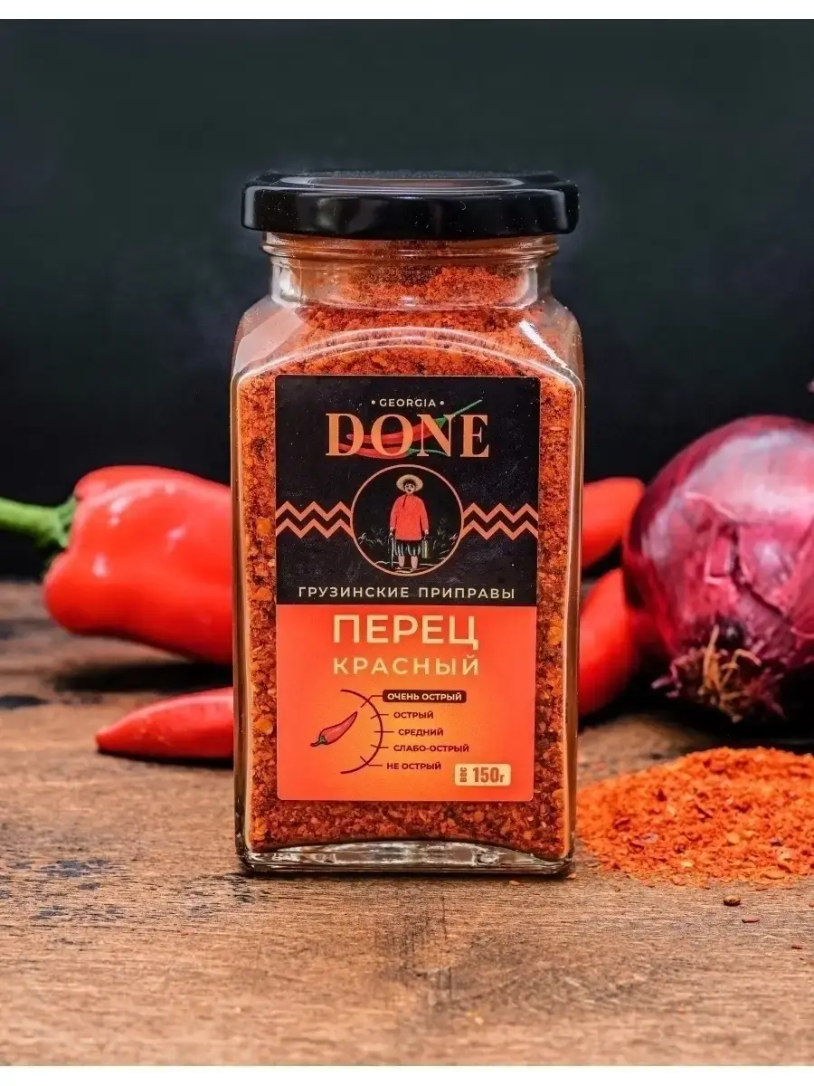 Красный перец острый чили дробленый обладает насыщенным жгучим вкусом. Молотый перец как и кайенский универсальная приправа идеально походит для мяса, для шашлыка, для рыбы, для курицы , овощей , морепродуктов, легких соусов и яиц. Используется для приготовления супов, салатов, для колбасы и маринадов. Хорошо сочетается с другими приправами , входит в состав популярных смесь специй : аджика острая и лайт, карри , хмели-сунели , гарам масала, шичими и др. Жгучий красный перец способен помогать переваривать тяжелую пищу, улучшает вкус говядины и свинины. Составляет основу острых соусов: Харисса, Табаско, Самбаль, Аджика абхазская ; в том числе специальных – чилийского, томатного кетчупа. К полезным свойствам стоит отнести болеутоляющее и антибактериальное действие. Паприка красная острая способствует выработке так называемого "гормона счастья", снятию стресса, а также повышает иммунитет человека. Соберите свою коллекцию вкусов со всего мира вместе с DONE. Мы будем рады вашим отзывам, фотографиям блюд и будем особенно благодарны, если вы добавите наш бренд в избранное, потому что нам есть чем вас удивить! Выбирайте лучшие грузинские специи!
