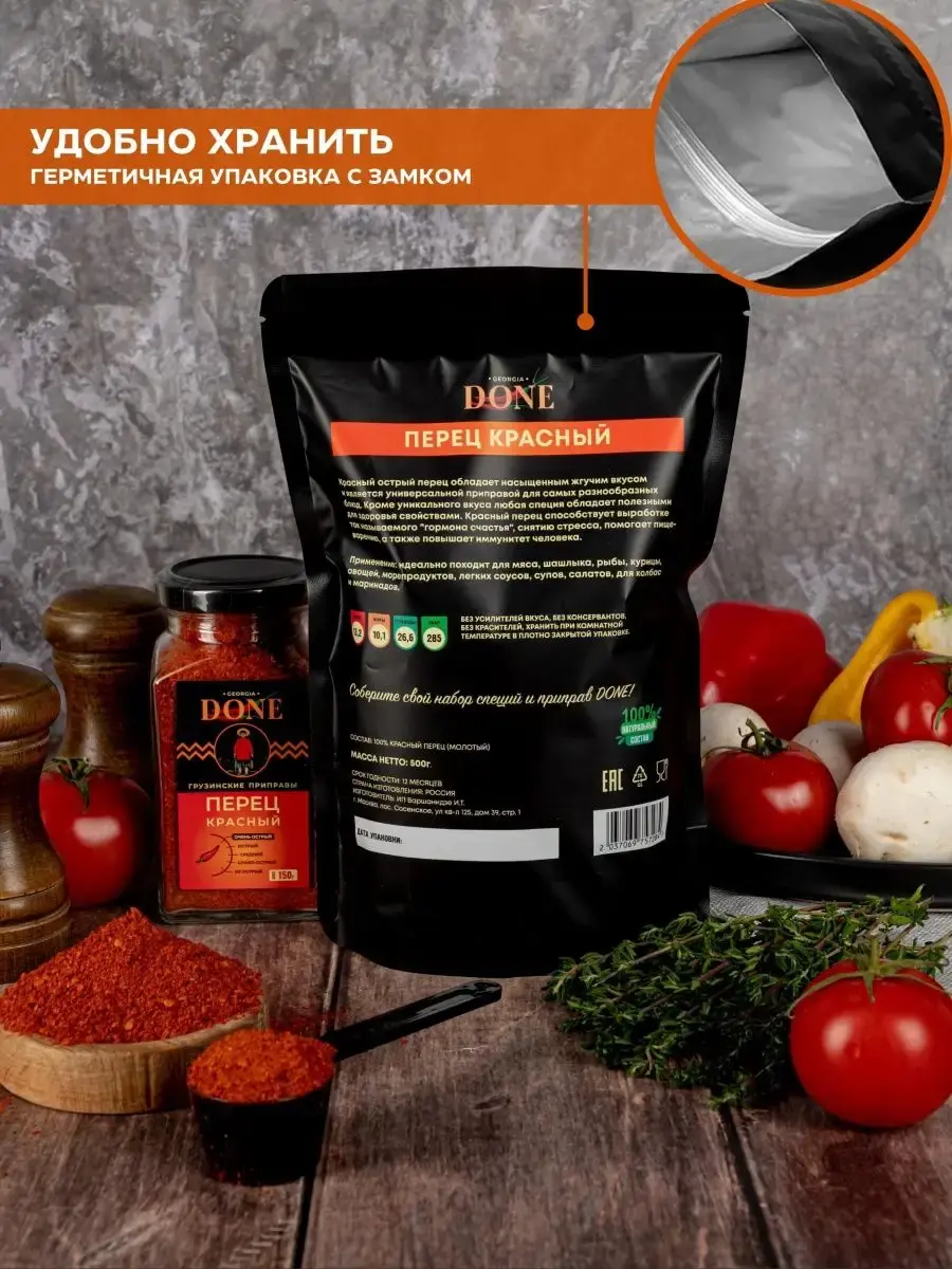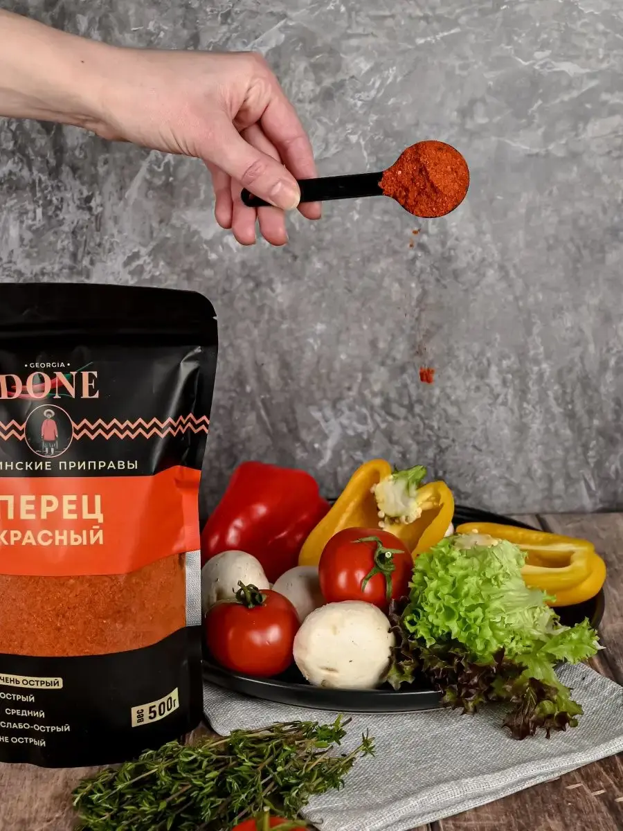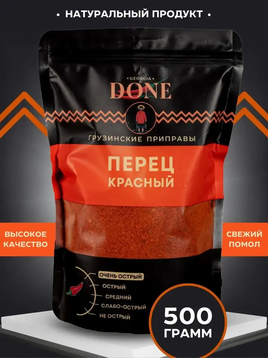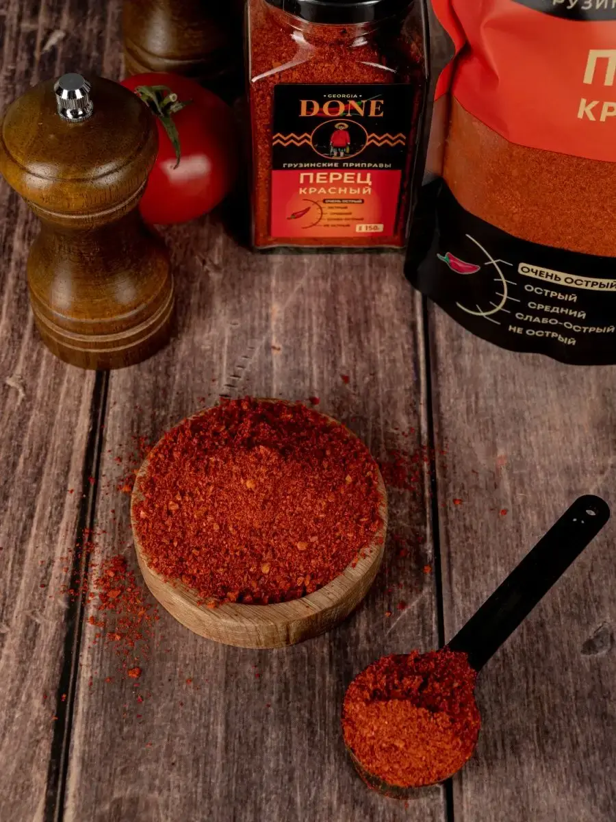 Красный перец острый чили дробленый обладает насыщенным жгучим вкусом. Молотый перец как и кайенский универсальная приправа идеально походит для мяса, для шашлыка, для рыбы, для курицы , овощей , морепродуктов, легких соусов и яиц. Используется для приготовления супов, салатов, для колбасы и маринадов. Хорошо сочетается с другими приправами , входит в состав популярных смесь специй : аджика острая и лайт, карри , хмели-сунели , гарам масала, шичими и др. Жгучий красный перец способен помогать переваривать тяжелую пищу, улучшает вкус говядины и свинины. Составляет основу острых соусов: Харисса, Табаско, Самбаль, Аджика абхазская ; в том числе специальных – чилийского, томатного кетчупа. К полезным свойствам стоит отнести болеутоляющее и антибактериальное действие. Паприка красная острая способствует выработке так называемого "гормона счастья", снятию стресса, а также повышает иммунитет человека. Соберите свою коллекцию вкусов со всего мира вместе с DONE. Мы будем рады вашим отзывам, фотографиям блюд и будем особенно благодарны, если вы добавите наш бренд в избранное, потому что нам есть чем вас удивить! Выбирайте лучшие грузинские специи!