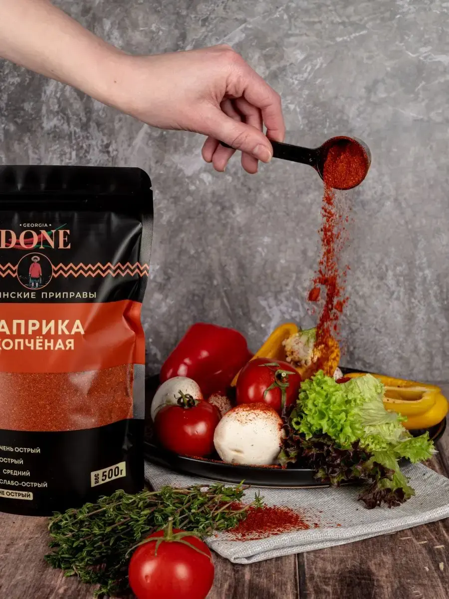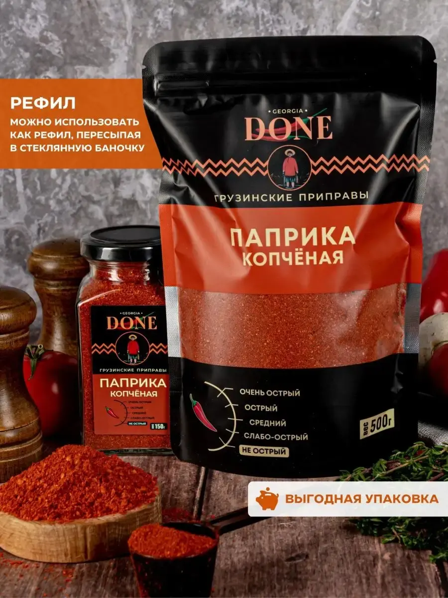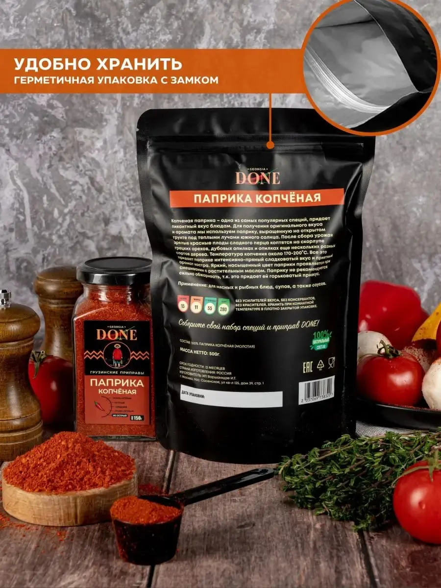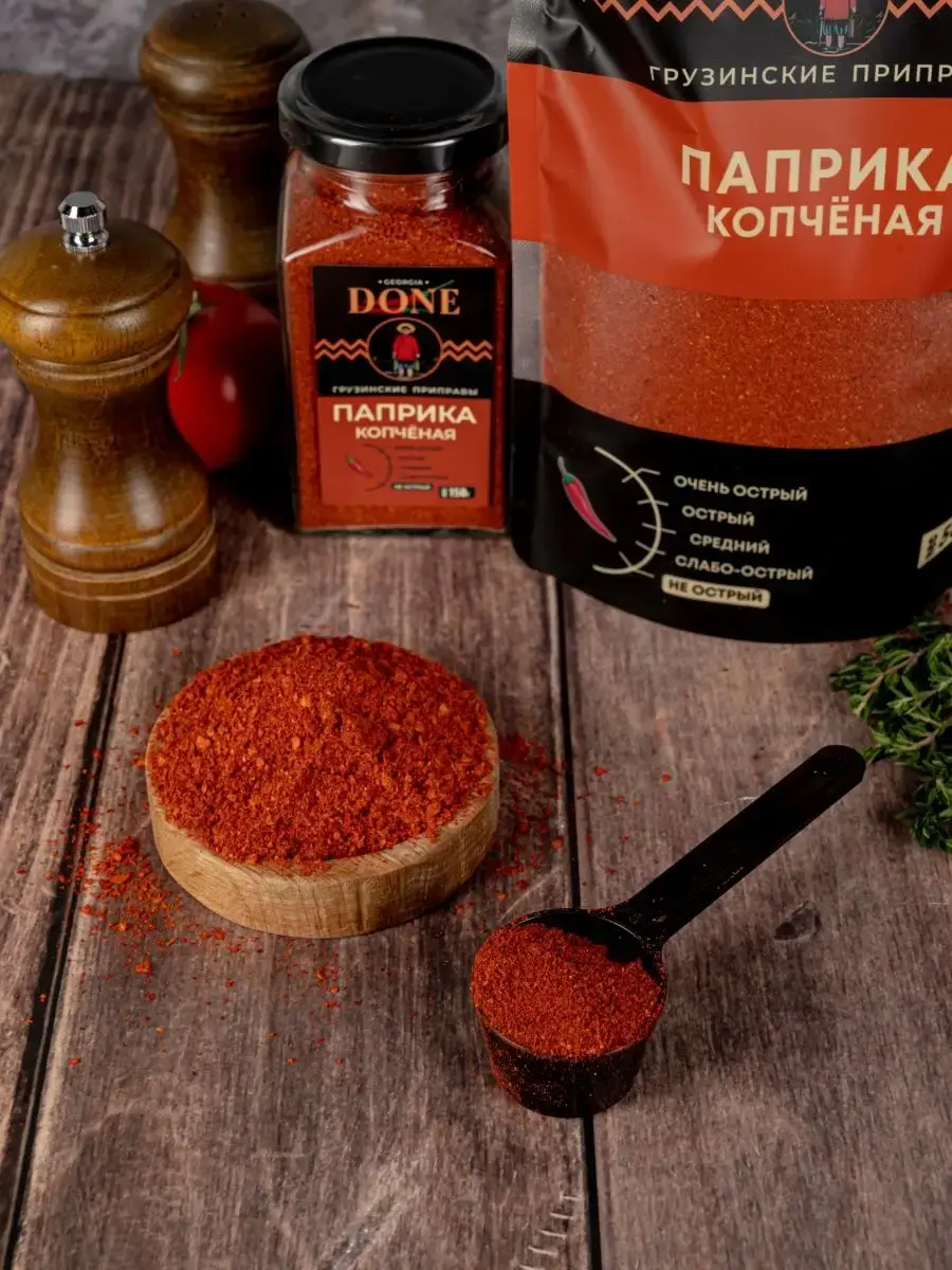 Копченая красная паприка , как и сладкая паприка - это универсальная приправа. Специя премиум качества, без ароматизаторов, мелкого помола, отлично подходит для первых, вторых блюд и гарниров. Идеальна в приготовлении домашних мясных продуктов питания: колбасы, котлет, паштета и маринада. По новому открывает вкус блюд из бобовых, гуляша, плова , подходит для рыбы , жаркого из мяса свинины, говядины, баранины курицы и индейки шашлыка. Сочетается с чесноком корицей молотой луком репчатым мятой сушеной базиликом .Копченый перец стоит использовать для ароматизации вегетарианских блюд и соусов, аджики, заправки салатов и запеканок, отличный для картофеля. И, конечно, если приправить копченой паприкой суп или борщ он приобретет новый незабываемый аромат. Приправа найдет достойное применение в праздники для барбекю, еды на гриле. Попробовав однажды наши пряности вы уже не сможете обходиться без них! Соберите свою коллекцию вкусов со всего мира вместе с DONE. Мы будем рады вашим отзывам, фотографиям блюд и будем особенно благодарны, если вы добавите наш бренд в избранное, потому что нам есть чем вас удивить! Выбирайте лучшие грузинские специи! Состав: паприка копченая молотая 100%