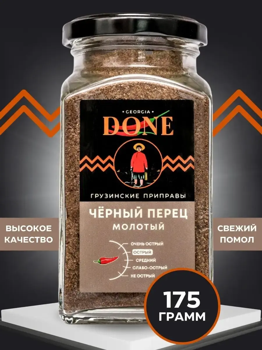 Черный молотый перец - универсальная приправа, его еще называют "королем специй". Мы используем его ежедневно для приготовления различных блюд. Чёрный перчик подходит для приготовления мяса рыбы овощей супов и соусов. Мы используем только высококачественное сырье и помол первой фракции(среднее между дробленым и молотым), не в порошок, так перец лучше сохраняет и раскрывает свой жгучий острый вкус и пряный аромат. Соберите свою коллекцию вкусов со всего мира вместе с DONE.
