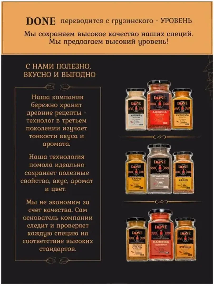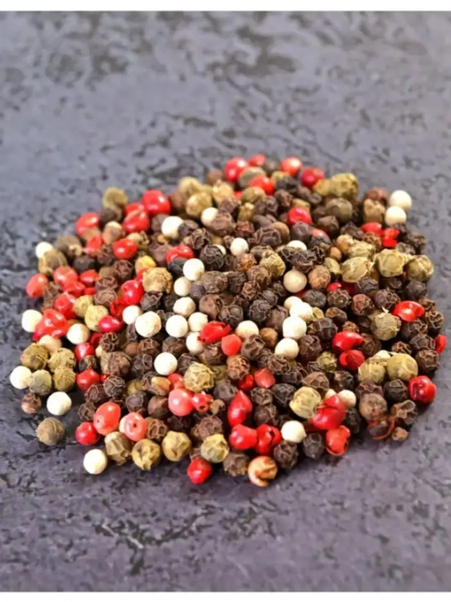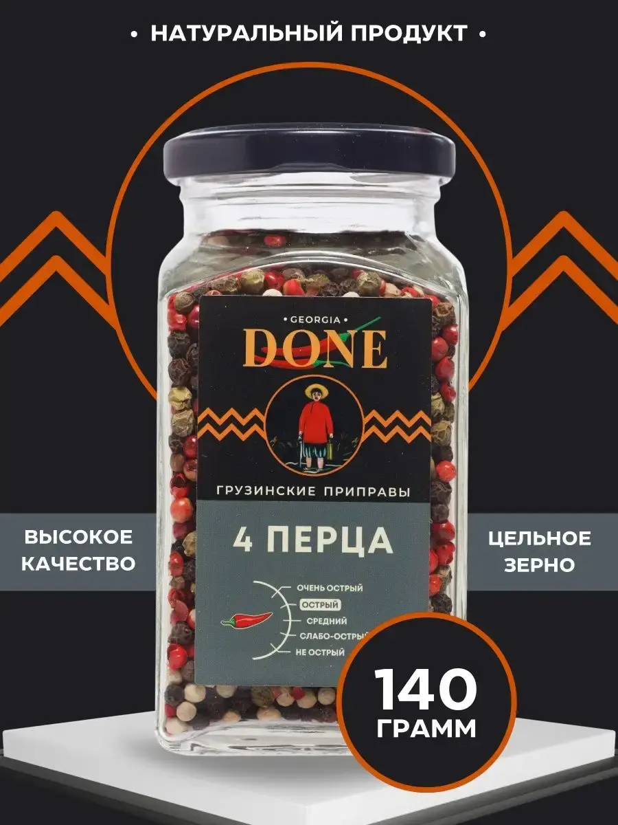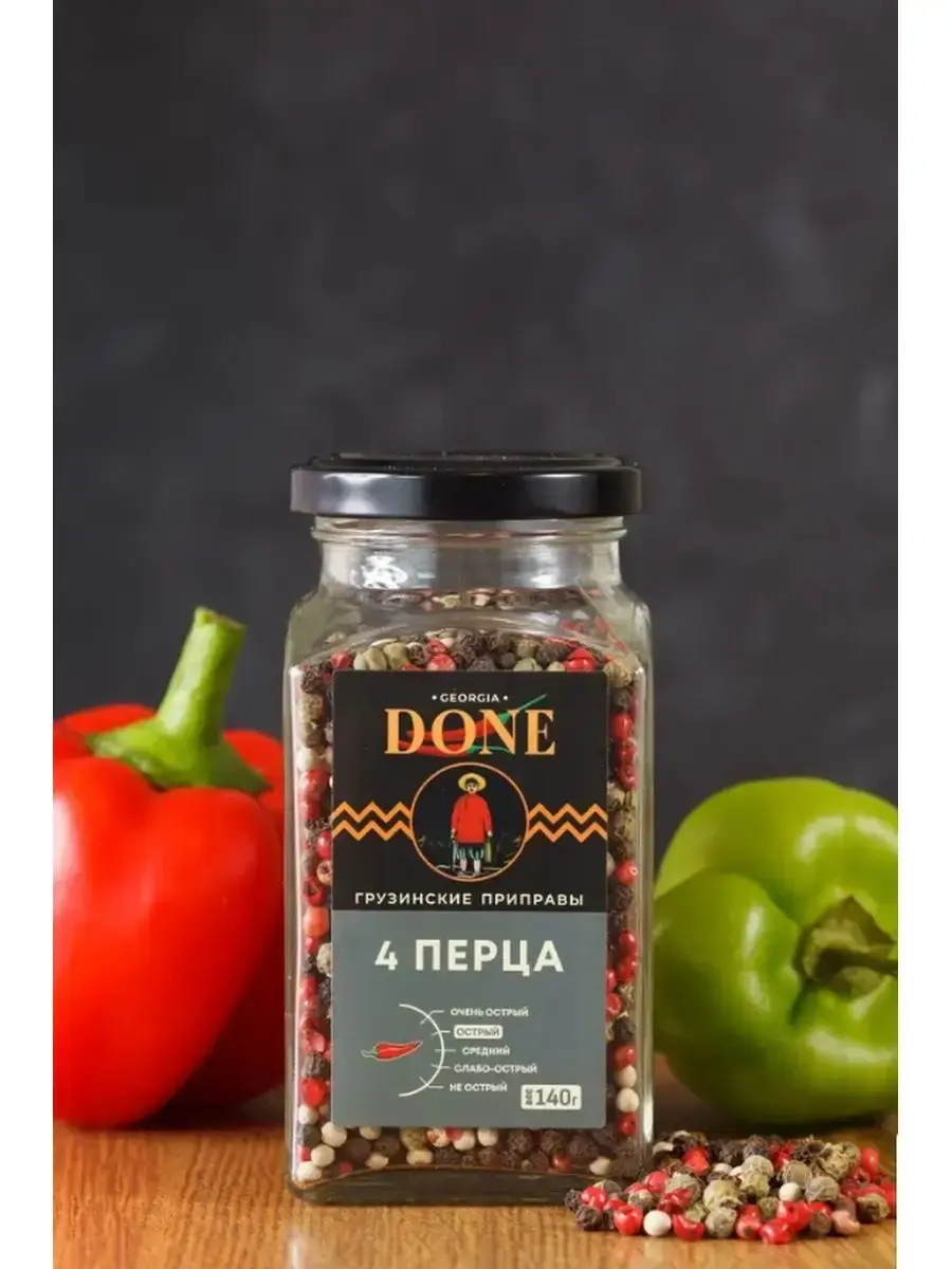 4 четыре перца горошком - это уникальная ароматная смесь из 4 видов перцев. В состав приправы входит перец черный и белый горошек, перец розовый и зеленый, обладающие неповторимыми вкусами и душистым ароматом. Смесь перцев горошком используется при приготовлении бульонов супов подлив гуляша соуса, добавляется во все виды мяса и мясных изделий блюда из бобовых, а также используется при приготовлении тушеных овощей рыбы грибов, риса, картофеля, при солении и как специи для маринования овощей и грибов, а так же специи для засолки соленых огурцов . Смесью также приправляют десерты (пряники, кондитерские крема), коктейли, пунши, горячий чай. Соберите свой букет специй с пряностями и приправами DONE, откройте для себя вкусы со всего мира. Мы будем рады вашим отзывам, фотографиям блюд и будем особенно благодарны, если вы добавите наш бренд в избранное, потому что нам есть чем вас удивить! Выбирайте лучшие грузинские специи!
